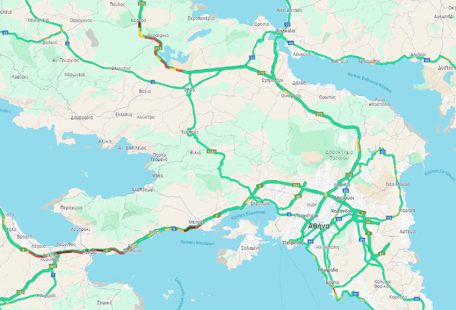 Ειδικότερα, με πολύ χαμηλές ταχύτητες κινούνται τα οχήματα από τα διόδια του Ισθμού μέχρι τους Αγίους Θεοδώρους, ενώ μεγάλες καθυστερήσεις παρατηρούνται στο ύψος της Κινέττας και των Μεγάρων.