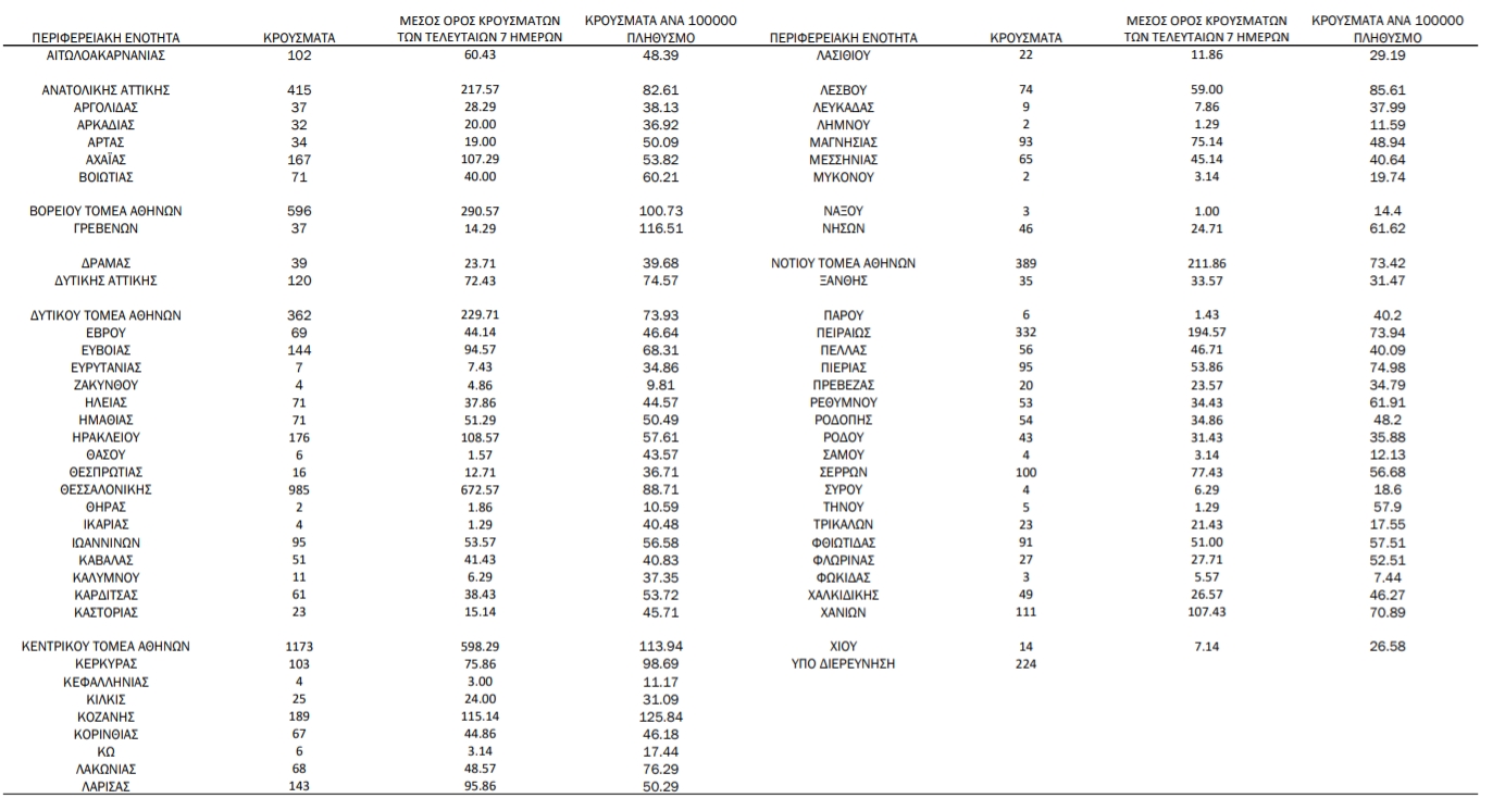 Αναλυτικά η διασπορά των νέων κρουσμάτων σήμερα στην υπόλοιπη Ελλάδα