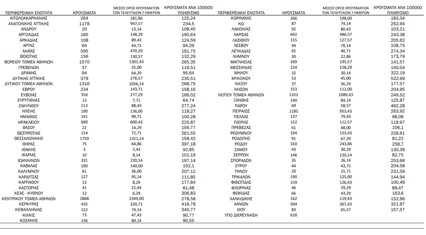 Αναλυτικά η διασπορά των νέων κρουσμάτων σήμερα στην υπόλοιπη Ελλάδα