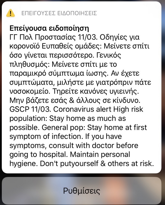 ΜΗΝΥΜΑ ΣΤΑ ΚΙΝΗΤΑ ΤΗΛΕΦΩΝΑ ΑΠΟ ΤΗ ΓΓ ΠΟΛΙΤΙΚΗΣ ΠΡΟΣΤΑΣΙΑΣ ΓΙΑ ΤΟΝ ΚΟΡΟΝΟΙΟ ΚΟΝΤΑΡΙΝΗΣ ΓΙΩΡΓΟΣ EUROKINSSI