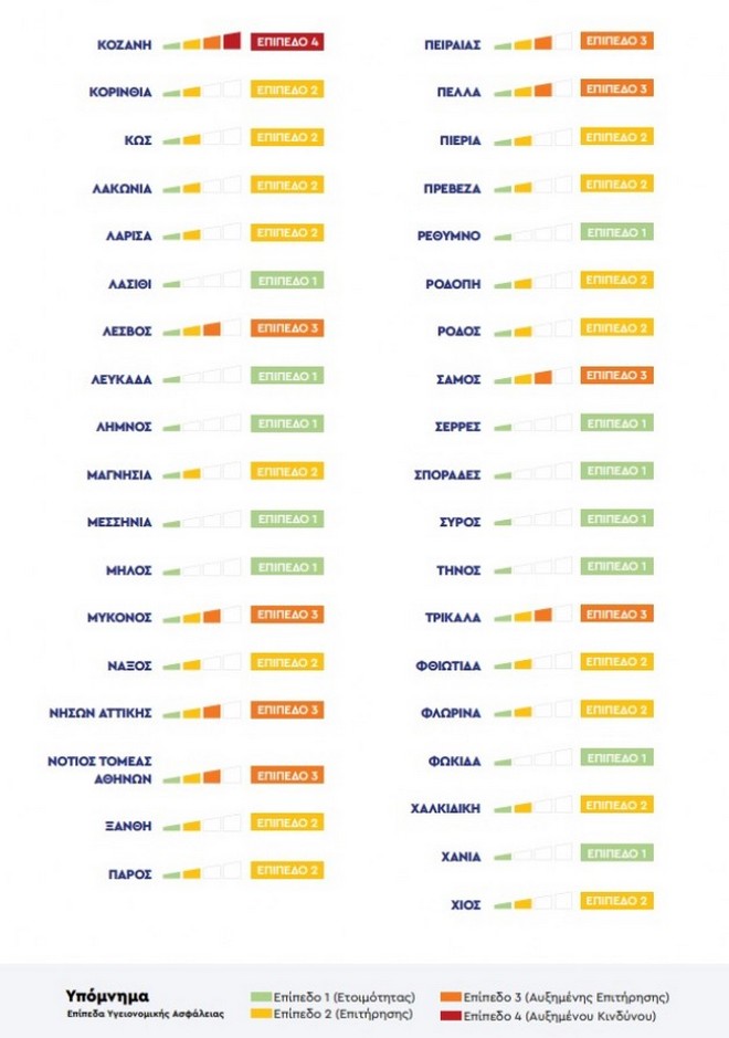 Από τις 74 περιφερειακές ενότητες της χώρας, οι 27 ανήκουν στο επίπεδο 1, (σε ετοιμότητα), οι 25 βρίσκονται στο επίπεδο 2, (σε κατάσταση επιτήρησης), 21 στο επίπεδο 3, (σε κατάσταση αυξημένης επιτήρησης), και μία στο επίπεδο 4 (αυξημένου κινδύνου).