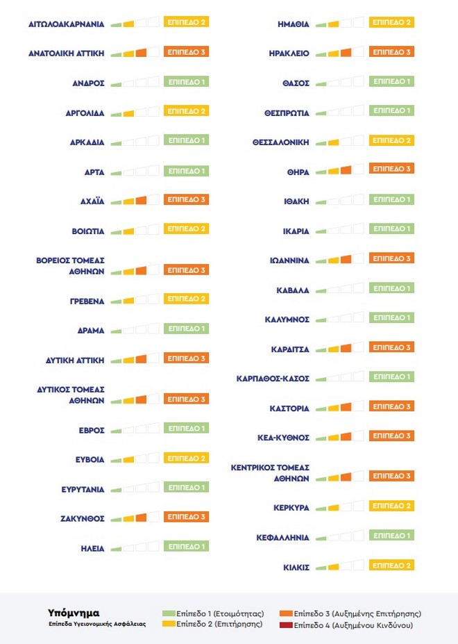 Μέχρι στιγμής, με βάση τον Χάρτη Υγειονομικής Ασφάλειας και Προστασίας, οι Περιφερειακές Ενότητες έχουν κατανεμηθεί ως εξής: