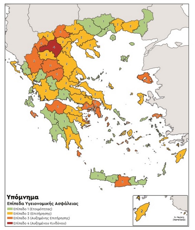 Ο Χάρτης περιλαμβάνει τέσσερα επίπεδα προληπτικών μέτρων και κανόνων για κάθε Περιφερειακή Ενότητα της χώρας. Δείτε αναλυτικά.