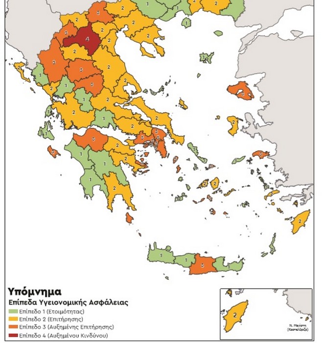 Στο Επίπεδο 1 (από το Επίπεδο 2) πέφτουν οι Π.Ε Γρεβενών, Λακωνίας, Πάρου που γίνονται πράσινες (από πορτοκαλί).