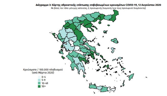 Τα στοιχεία που παρουσιάζονται αφορούν περιστατικά από την επιδημιολογική επιτήρηση της νόσου από το νέο κορονοϊό (COVID19), με βάση τα δεδομένα που έχουν δηλωθεί στον ΕΟΔΥ και καταγραφεί μέχρι τις 12 Αυγούστου 2020 (ώρα 15:00).