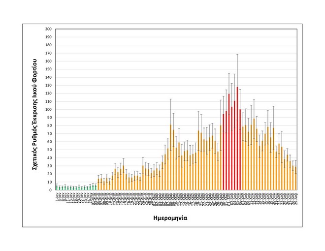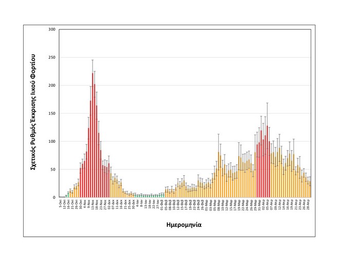 Όπως φαίνεται στα διαγράμματα που παρουσιάζει το ΑΠΕ-ΜΠΕ (επισυνάπτονται), μετά την πρώτη εβδομάδα του Απριλίου και μέχρι το τέλος του μήνα έχει σταδιακά επέλθει μία σημαντική αποκλιμάκωση της συγκέντρωσης του ιού στα αστικά απόβλητα.