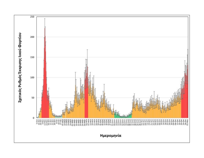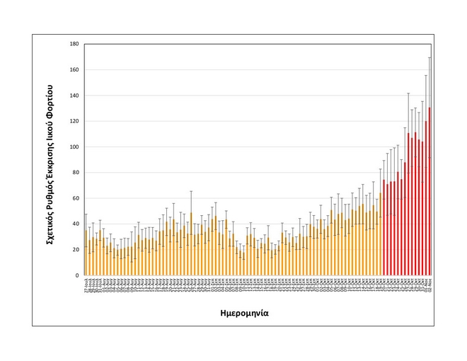 -Αυξημένη (+20%) σε σχέση με τη μέση τιμή των δύο αμέσως προηγούμενων μετρήσεων του Σαββάτου 30/10 και της Κυριακής 31/10.