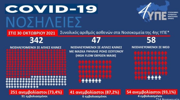 Στις απλές κλίνες οι νοσηλευόμενοι είναι 342 εκ των οποίων 251 είναι ανεμβολίαστοι, το 73,4%.