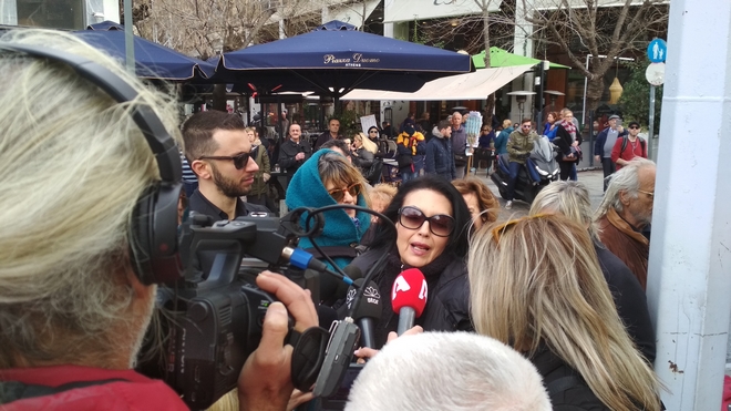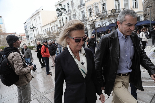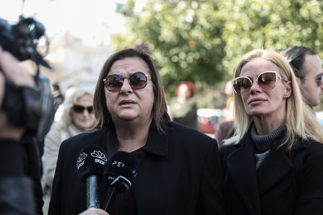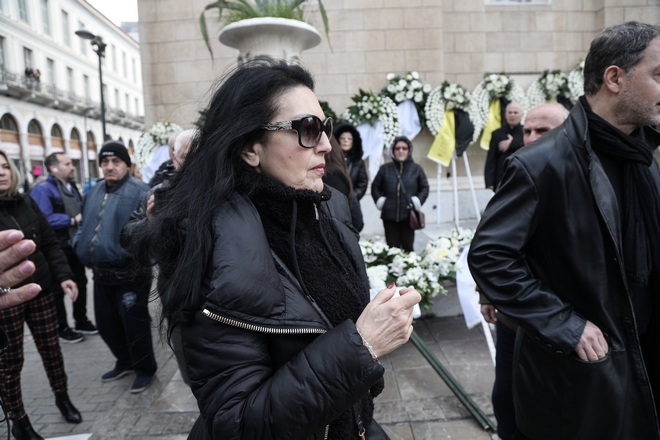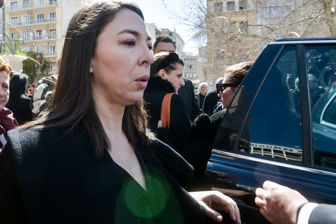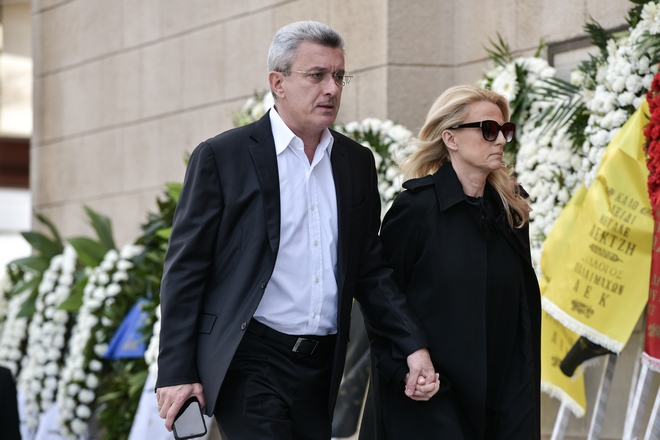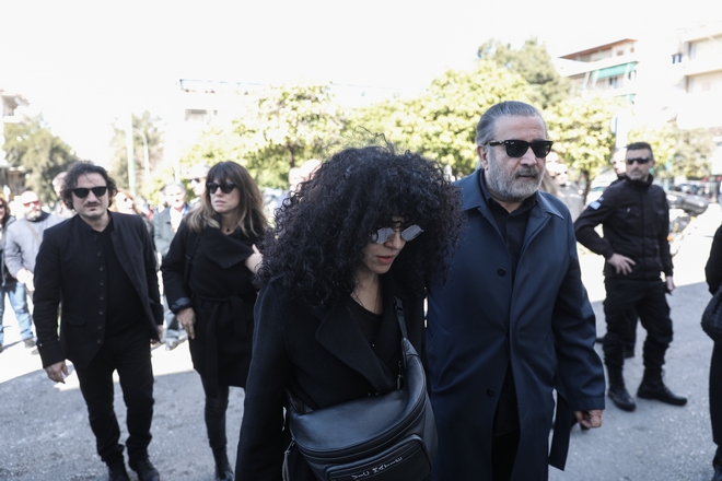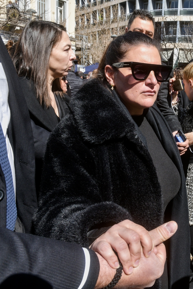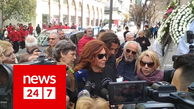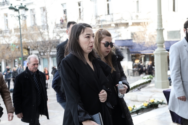 Συντετριμμένη εμφανίστηκε η σύζυγος του ηθοποιού, Αλίκη Κατσαβού, η οποία μαυροφορεμένη και υποβασταζόμενη έφτασε από νωρίς το πρωί.