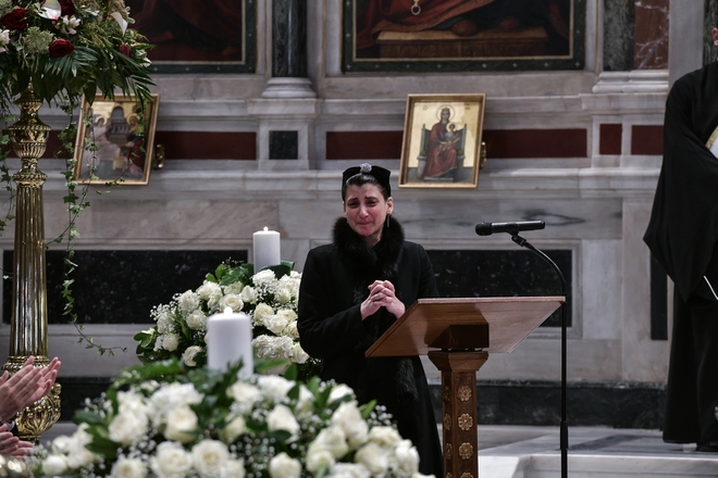 Είμαι η κόρη του. Είμαι μια από τα χιλιάδες παιδιά του. Πιστεύω πως ο λόγος που αποφάσισε, το τονίζω αποφάσισε , να είναι σήμερα εδώ, δηλαδή να φύγει, είναι επειδή κάποιος από πάνω πρέπει να του σφύριξε ότι έρχεται ανάσταση νεκρών πολύ σύντομα. Ο μπαμπάς μας έφυγε μετά από μια οικογενειακή γιορτή, ήμασταν πάνω απ’ το κεφάλι του, τραγουδούσαμε, λέγαμε αστεία, γελούσαμε και του δείχναμε βιντεάκια τον εαυτό του. Τον αφήσαμε να κοιμηθεί με ένα πρόσωπο γαλήνιο. Εγώ σήμερα γιορτάζω τον άνθρωπο που εκπροσώπησε τη ζωή. Αν ήταν η ζωή άνθρωπος, θα σηκωνόταν. Είσαι ο μπαμπάς μου και Σ-Α-Γ-Α-Π-Ω.