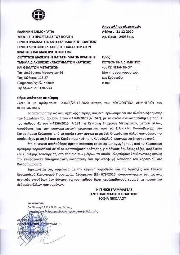 Σε επιστολή που έστειλε στη συνήγορο του Δημήτρη Κουφοντίνα στις 31 Δεκεμβρίου 2020, η Γ.Γ Αντεγκληματικής Πολιτικής αναφέρει ότι “η Κεντρική Επιτροπή Μεταγωγών, μεταξύ άλλων, αποφάσισε και την επαναμεταγωγή κρατουμένων από το Ε.Α.Κ.Κ.Ν. Κασσαβετείας στα Καταστήματα Κράτησης από τα οποία είχαν αρχικά μεταχθεί. Ο αιτών και άλλοι κρατούμενοι, οι οποίοι είχαν μεταχθεί από το Κατάστημα Κράτησης Κορυδαλλού, επαναμετήχθησαν σε αυτό”.