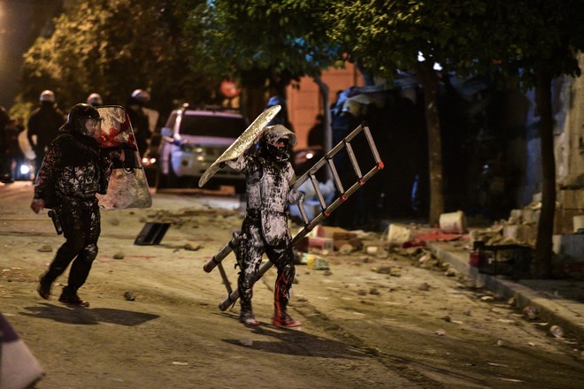 Μάλιστα ακόμα και κομμάτια από τσιμεντόλιθους ρίχνουν οι αντιεξουσιαστές που έχουν σπάσει από τους τοίχους που έφτιαξαν τα συνεργεία κατά την προηγούμενη εκκένωση για να καλυφθούν παράθυρα και πόρτες