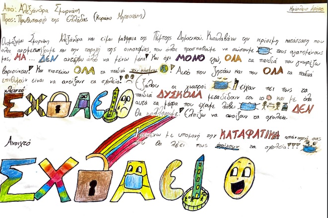“Καταλαβαίνω την κρίσιμη κατάσταση που όλοι αντιμετωπίζουμε και την ταραχή της οικονομίας, που όλοι προσπαθούμε να σώσουμε τους αγαπημένους μας… ΜΑ δεν αντέχω άλλο να μένω μέσα! Και όχι μόνο εγώ, όλα τα παιδιά που γνωρίζω βαριούνται! Και πιστεύω όλα τα παιδιά του κόσμου! Και αυτό που ζητάω και που όλα τα παιδιά επιθυμούν είναι να ανοίξουν τα σχολεία! Εξάλλου οι γιατροί είχαν πει πως τα παιδιά δύσκολα μεταδίδουν τον ιό και με όλα αυτά τα μέτρα που έχουμε λάβει ΔΕΝ θα κολλήσουμε! Ελπίζω να ανοίξουν τα σχολεία” γράφει η Αλεξάνδρα, προειδοποιώντας ουσιαστικά στην κατακλείδα του γράμματός της τον Κυριάκο Μητσοτάκη: