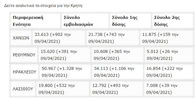 Συνολικά 79.251 άνθρωποι είχαν λάβει μέχρι και το βράδυ της Παρασκευής στην Κρήτη, τουλάχιστον μία δόση εμβολίου κατά του κορονοϊού, αριθμός που αντιστοιχεί σε ποσοστό 12,7% του πληθυσμού του νησιού όπως αναφέρει το Zarpanews.gr.