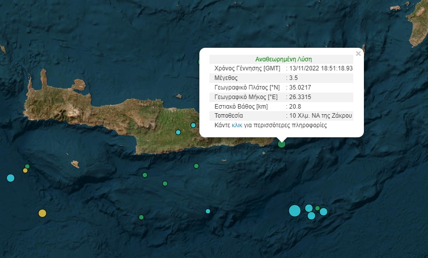 Σεισμό μεγέθους 3,5 Ρίχτερ κατέγραψε το Γεωδυναμικό Ινστιτούτο ανοιχτά της Σητείας στην Κρήτη, το βράδυ της Κυριακής.