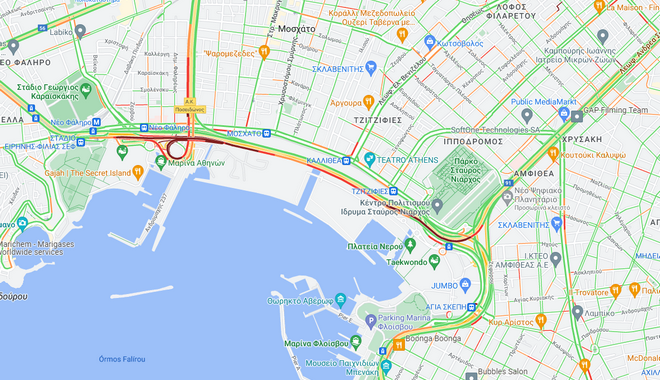Στο σημείο, δηλαδή στο ρεύμα της Ποσειδώνος προς την Αθήνα η κυκλοφορία των οχημάτων διεξάγεται με μεγάλη δυσκολία.
