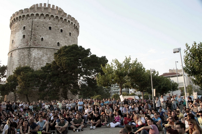 “Αγανακτισμένοι” και στο Λευκό Πύργο συνέχισαν τις διαμαρτυρίες τους για την κρίση, τα μέτρα λιτότητας και την οικονομική πολιτική της κυβέρνησης.