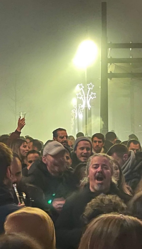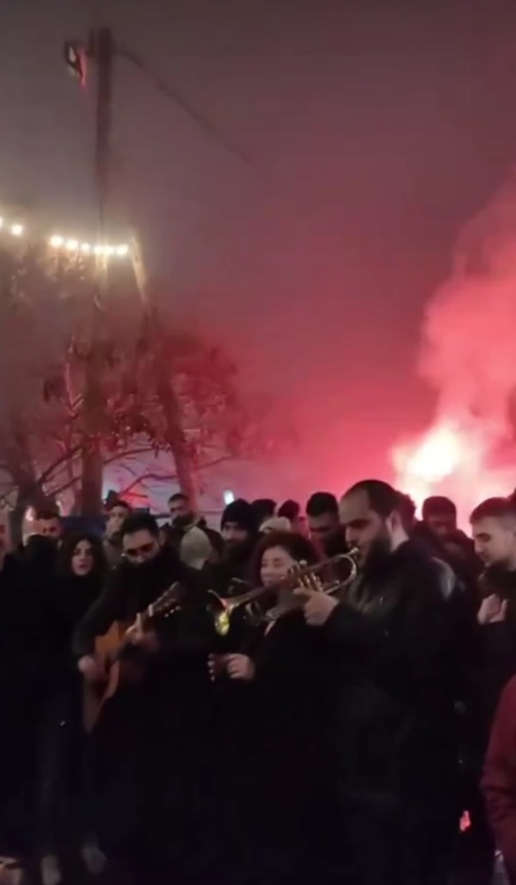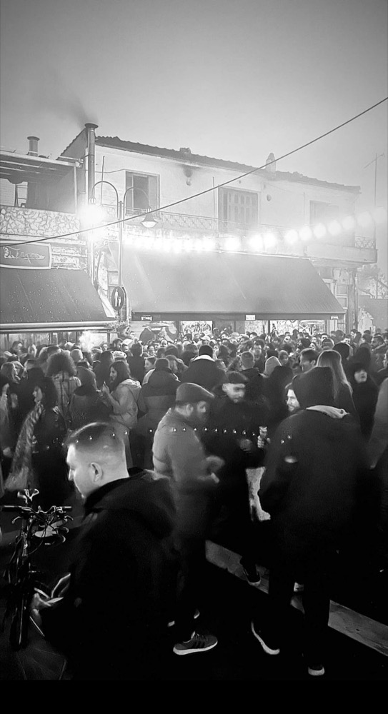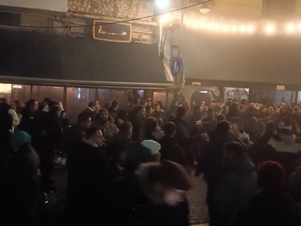 Έξω από το μεζεδοπωλείο «Τετάρτη» στο λόφο του Φρουρίου, βρέθηκε πλήθος κόσμου με φωτοβολίδες, όργανα, σπασμένα πιάτα και τραπέζια για να γιορτάσει το αναγκαστικό κλείσιμο του μαγαζιού που φιλοξένησε πολλά γλέντια, σύμφωνα με το onlarissa.gr.