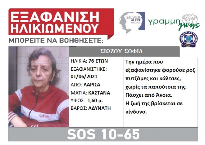 Οι έρευνες έχουν εστιάσει στον Πηνειό ποταμό, στην ευρύτερη περιοχή του Αισθητικού Άλσους της Λάρισας. Για την ηλικιωμένη γυναίκα έχει εκδοθεί και Silver Alert.