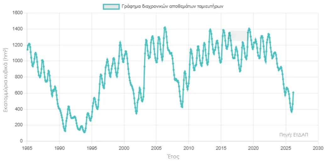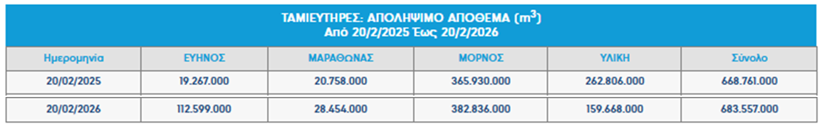 Απ: Τα αποθέματα της Παρασκευής 20 Φεβρουαρίου στους τέσσερις κύριους ταμιευτήρες της Αττικής (Μόρνος, Εύηνος, Υλίκη, Μαραθώνας) ανέρχονται σε περίπου 683,5 εκατ. κυβικά μέτρα. Η εικόνα είναι ελαφρώς βελτιωμένη σε σχέση με την αντίστοιχη περσινή περίοδο και αυτό οφείλεται στην πορεία των φετινών βροχοπτώσεων. Οι ιδιαίτερα αυξημένες βροχοπτώσεις στη Δυτική Στερεά Ελλάδα, ήδη από το φθινόπωρο, έδωσαν μια σημαντική «ανάσα», συμβάλλοντας στον ταχύτερο ρυθμό αναπλήρωσης των αποθεμάτων. Ενδεικτικά, στις περιοχές που τροφοδοτούν τους ταμιευτήρες Μόρνου-Ευήνου, τον Ιανουάριο σημειώθηκαν κατά τόπους ύψη βροχής υπερτριπλάσια του Ιανουαρίου 2025, ενώ για τον Φεβρουάριο οι καταγραφές δείχνουν ήδη ύψη ακόμα και πενταπλάσια από τα περσινά. Αυτό σημαίνει ότι για το επερχόμενο καλοκαίρι δεν αναμένεται άμεσος κίνδυνος για την υδατική μας επάρκεια.
