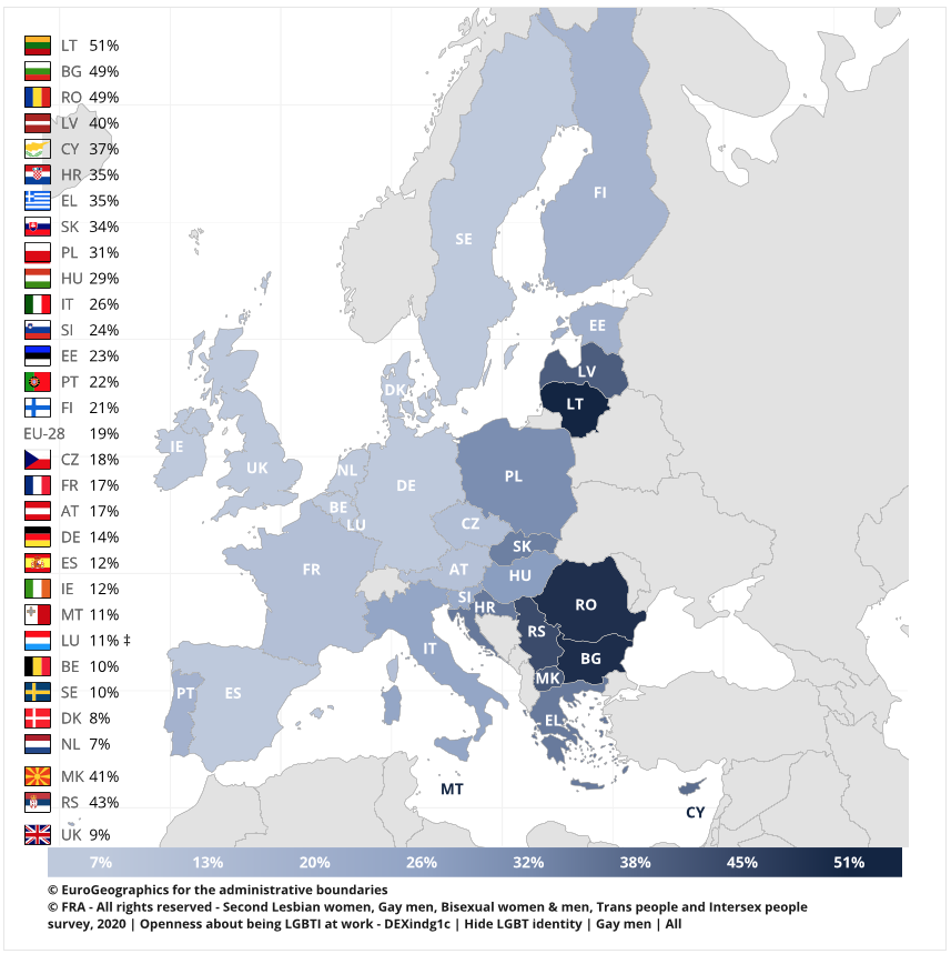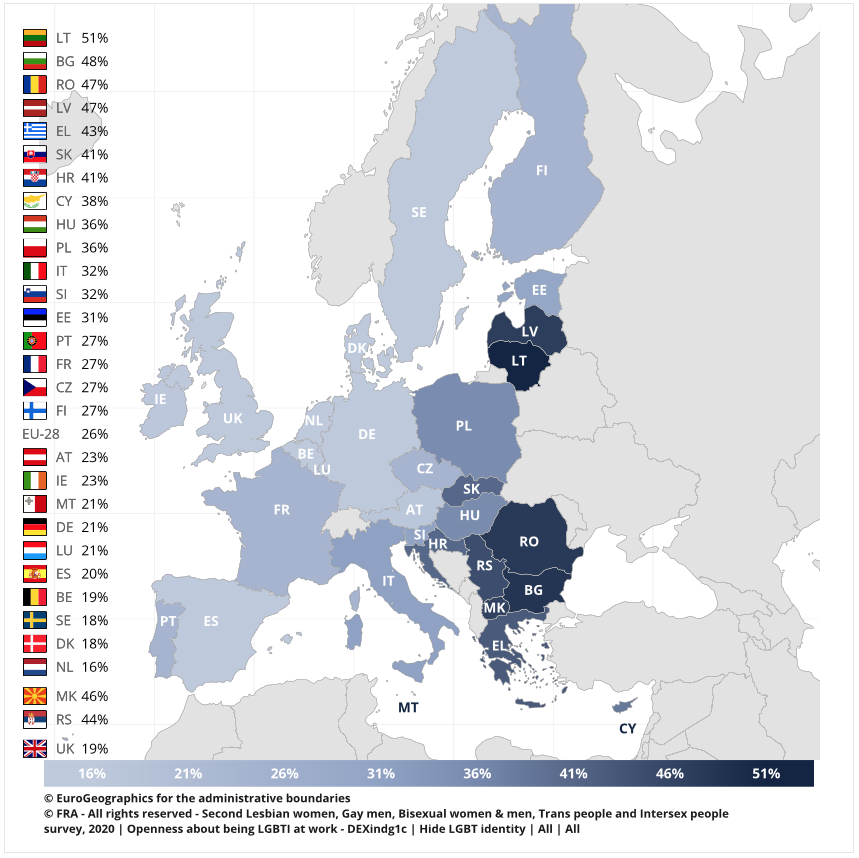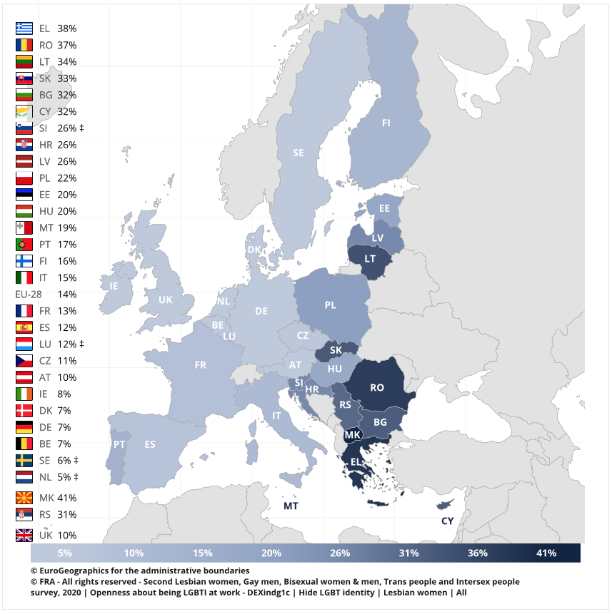 Το πλέον εντυπωσιακό στοιχείο είναι ότι η Ελλάδα κατέχει την πρώτη θέση “μυστικότητας” σε ότι αφορά στις λεσβίες με ποσοστό 38% στην Ευρώπη των 28 όταν ο μέσος όρος στη συγκεκριμένη γεωγραφική ζώνη να είναι στο 14%. Σχετικά καλύτερη είναι η κατάσταση για τους Έλληνες ομοφυλόφιλους καθώς το 35% δηλώνει ότι κρύβει τις σεξουαλικές του προτιμήσεις στον χώρο της δουλειάς, το 52% έχει “ανοιχτεί” επιλεκτικά και ένα ποσοστό 13% είναι ανοιχτά γκέι.