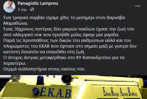 Την είδηση γνωστοποίησε ο διασώστης του ΕΚΑΒ και δημοτικός σύμβουλος, Παναγιώτης Λάμπρου μέσα από ανάρτηση στο Facebook.