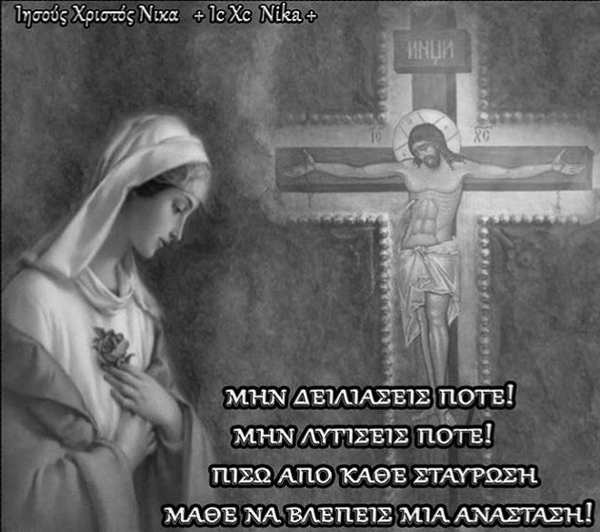 Στην μία από αυτές υπάρχει μία εικόνα του εσταυρωμένου Χριστού με τη φράση “Ιησούς Χριστός Νικά” στην κορυφή και από κάτω τη λέζαντα: «Μην δειλιάσεις ποτέ, μην λυγίσεις ποτέ, πίσω από κάθε σταύρωση, μάθε να βλέπεις μια Ανάσταση».