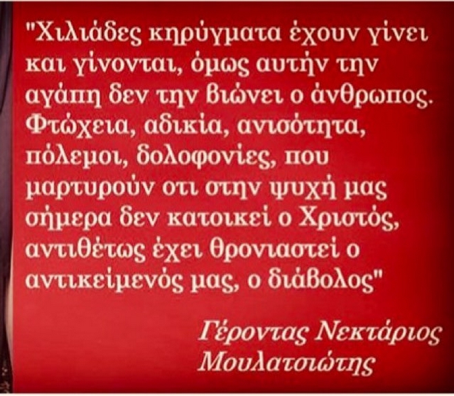 Σε δεύτερη ανάρτηση, γίνεται αναπαραγωγή αποσπάσματος από κείμενο του γέροντα Νεκτάριου Μουλατσιώτη, στο οποίο αναφέρει: «Χιλιάδες κηρύγματα έχουν γίνει και γίνονται, όμως αυτήν την αγάπη δεν την βιώνει ο άνθρωπος. Φτώχεια, αδικία, ανισότητα, πόλεμοι, δολοφονίες, που μαρτυρούν ότι στην ψυχή μας σήμερα δεν κατοικεί ο Χριστός, αντιθέτως έχει θρονιαστεί ο αντικείμενός μας, ο διάβολος».