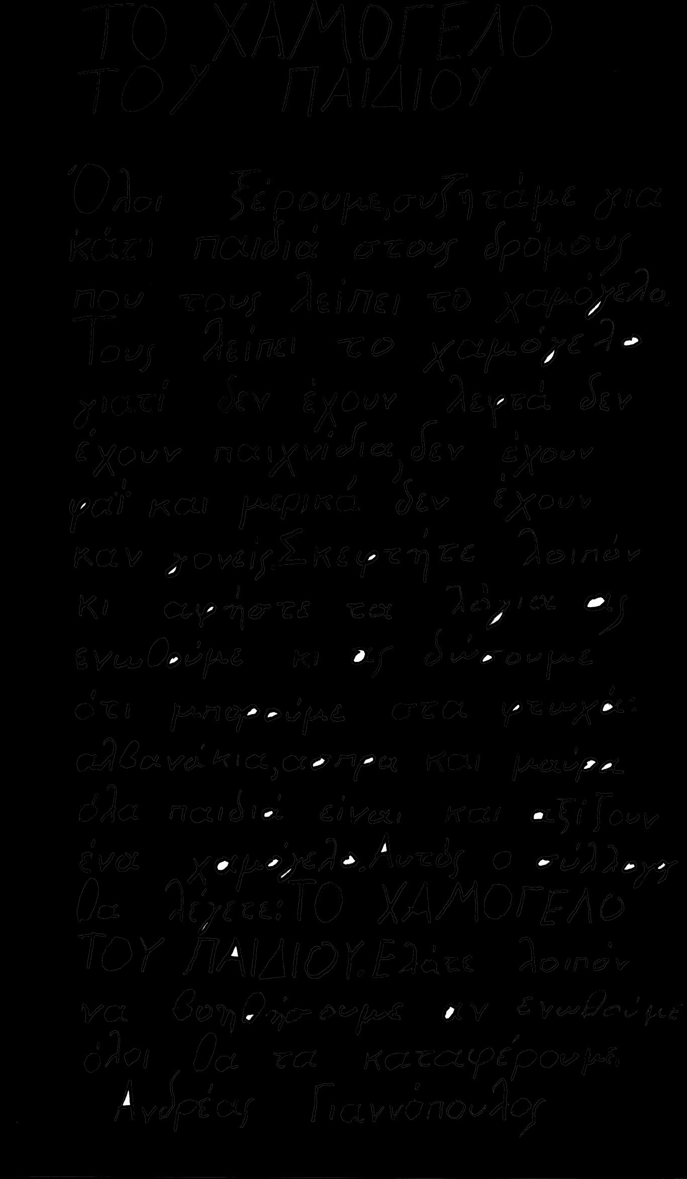 Όλοι ξέρουμε, συζητάμε για κάτι παιδιά στους δρόμους που τους λείπει το χαμόγελο. Τους λείπει το χαμόγελο γιατί δεν έχουν λεφτά, δεν έχουν παιχνίδια, δεν έχουν φα:ι και μερικά δεν έχουν καν γονείς. Σκεφτήτε λοιπόν κι αφήστε τα λόγια ας ενωθούμε κι ας δώσουμε ότι μπορούμε στα φτωχά: αλβανάκια, άσπρα και μαύρα, όλα παιδιά είναι και αξίζουν ένα χαμόγελο. Αυτός ο σύλλογος θα λέγετε: ΤΟ ΧΑΜΟΓΕΛΟ ΤΟΥ ΠΑΙΔΙΟΥ”.