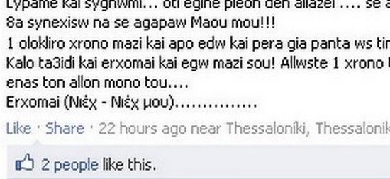 Μάλιστα, ο δράστης φαίνεται ότι μετά την αποτρόπαια πράξη του, αποχαιρέτησε τη γυναίκα της ζωής του, μέσα από το προσωπικό του προφίλ στο facebook, λέγοντας: “Λυπάμαι και συγγνώμη… ό,τι έγινε πλέον δεν αλλάζει… σε αγάπησα… σε αγαπάω και θα συνεχίσω να σε αγαπάω Μάου μου!!!