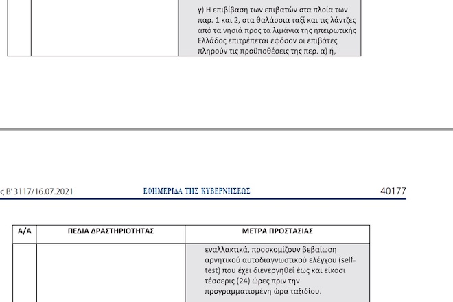 «Από την Παρασκευή 16 Ιουλίου 2021, η επιβίβαση των επιβατών στα πλοία καθώς και στα θαλάσσια ταξί και τις λάντζες από τα νησιά προς τα λιμάνια της ηπειρωτικής Ελλάδας επιτρέπεται εφόσον οι επιβάτες πληρούν τις κατωτέρω προϋποθέσεις: