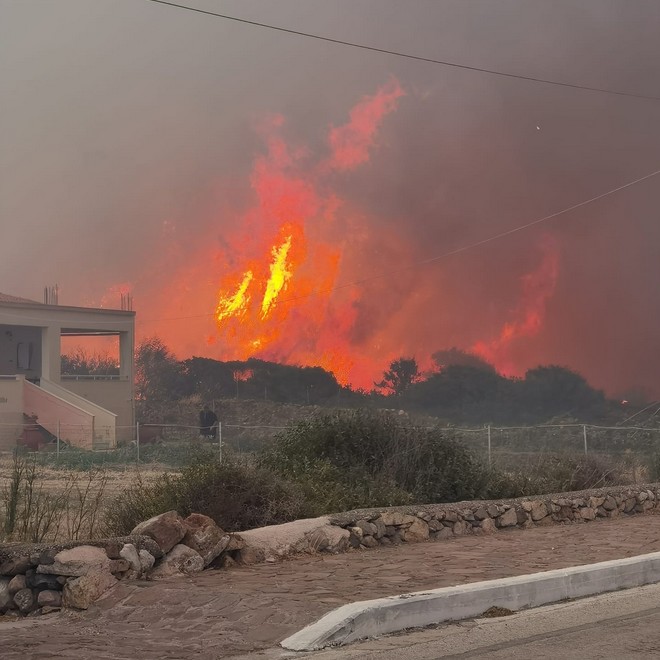 Η φωτιά φέρεται να κατευθύνεται προς το δρόμο που συνδέει τη Βρίσα με τα Βατερά, με τις πυροσβεστικές δυνάμεις να δίνουν μάχη για να σώσουν όσα σπίτια μπορούν.