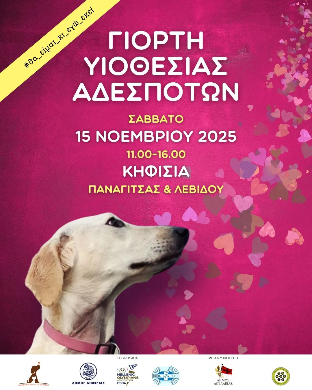 Μια μεγάλη γιορτή αφιερωμένη στην υπεύθυνη υιοθεσία αδέσποτων ζώων πρόκειται να πραγματοποιηθεί στην Κηφισιά. Η εκδήλωση έχει προγραμματιστεί για το Σάββατο, 15 Νοεμβρίου, και θα λάβει χώρα στο κέντρο της πόλης, στη συμβολή των οδών Παναγίτσας και Λεβίδου. Το κοινό μπορεί να επισκεφθεί την εκδήλωση από τις 11:00 π.μ. έως τις 4:00 μ.μ.