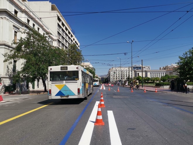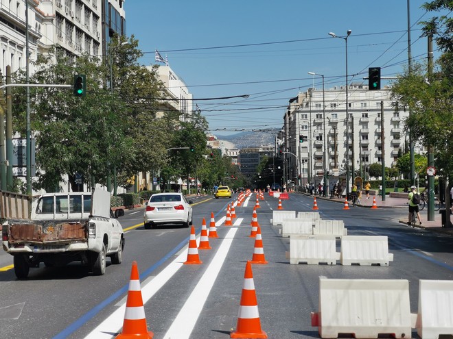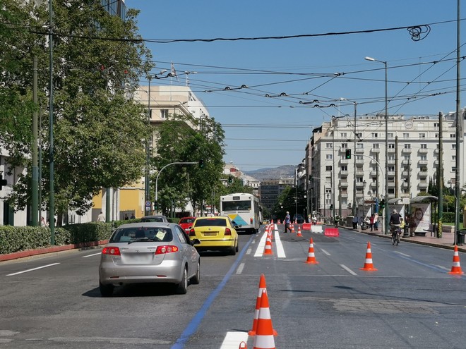 Οι λωρίδες που είναι διαθέσιμες για τα ΙΧ και τα λεωφορεία είναι πλέον δύο, καθώς οι υπόλοιπες έχουν αρχίσει να μετατρέπονται σε πεζόδρομο και ποδηλατόδρομο, στα πλαίσια του “Μεγάλου Περιπάτου της Αθήνας”.