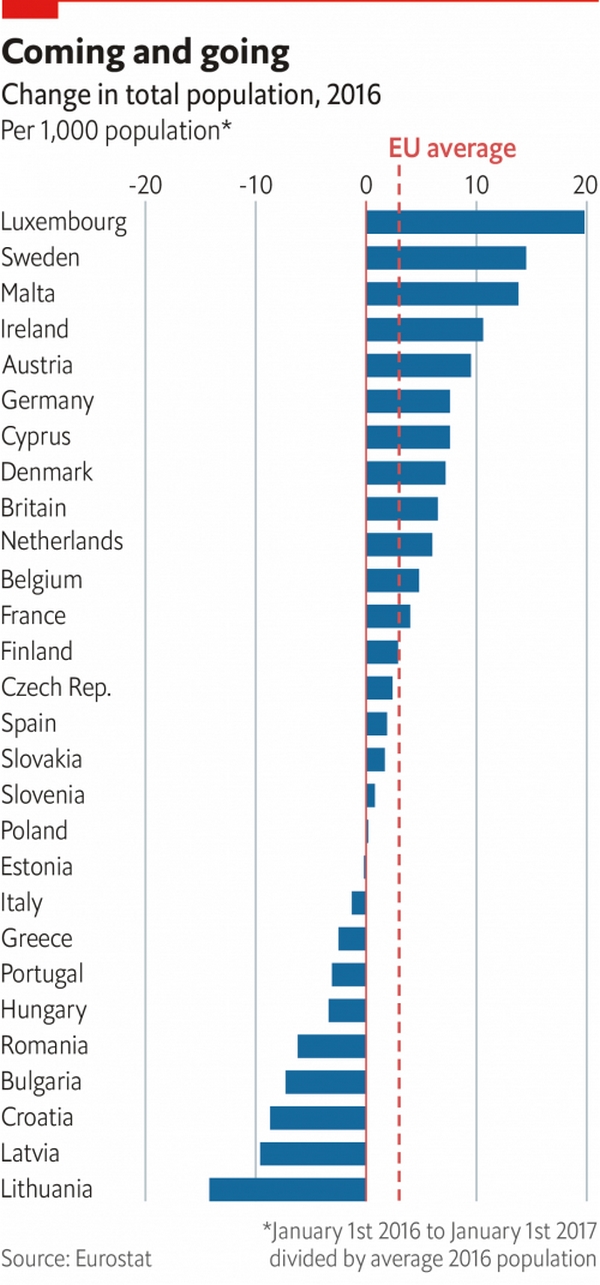 Η μεγαλύτερη σχετική αύξηση σημειώθηκε στο Λουξεμβούργο (+19,8 ανά 1.000 κατοίκους), τη Σουηδία (+ 14,5 ‰) και τη Μάλτα (+ 13,8 ‰). Αντίθετα, η μεγαλύτερη μείωση σημειώθηκε στη Λιθουανία (-14,2 ‰), τη Λετονία (-9,6 ‰) και την Κροατία (-8,7 ‰).