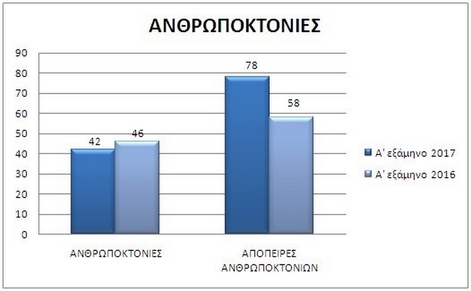 Το Α’ εξάμηνο του 2017 διαπράχθηκαν σε όλη την Επικράτεια 42 ανθρωποκτονίες με πρόθεση, ενώ το αντίστοιχο περσινό διάστημα είχαν διαπραχθεί 46 ανθρωποκτονίες. Επίσης, διαπράχθηκαν 78 απόπειρες ανθρωποκτονίας, έναντι 58 που είχαν καταγραφεί το Α’ εξάμηνο του 2016. Εξιχνιάστηκαν 98 περιπτώσεις τετελεσμένων ανθρωποκτονιών ή αποπειρών, επί συνόλου 120 περιπτώσεων, ποσοστό το οποίο ανέρχεται περίπου σε 81,7%.