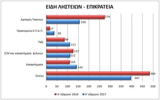 Ειδικότερα, σε σύγκριση με το Α’ εξάμηνο του 2016, καταγράφονται λιγότερες ληστείες και κλοπές σε οικίες και καταστήματα, λιγότερες ληστείες σε Σούπερ Μάρκετ – Καταστήματα Ψιλικών και Τράπεζες καθώς και λιγότερες αρπαγές τσαντών.