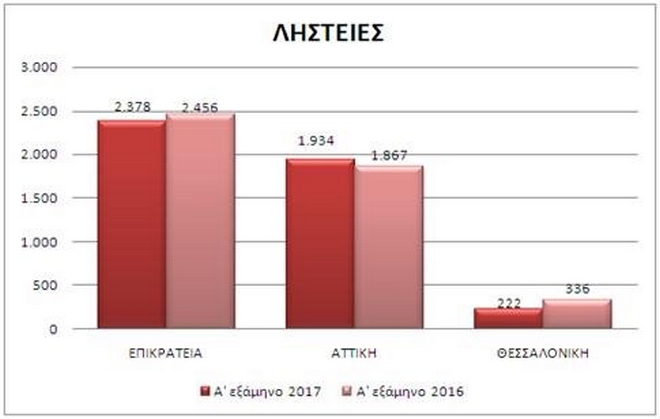 Το Α΄ εξάμηνο του τρέχοντος έτους διαπράχθηκαν σε όλη την Επικράτεια 78 λιγότερες ληστείες, σε σχέση με το αντίστοιχο διάστημα του 2016 (2.378 έναντι 2.456). Επίσης διαπράχθηκαν 146 απόπειρες ληστείας, έναντι 177, που είχαν καταγραφεί το Α’ εξάμηνο του 2016.