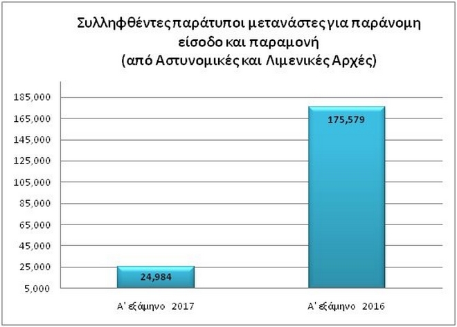 Το Α’ εξάμηνο του 2017 συνελήφθησαν συνολικά, από τις Αστυνομικές και τις Λιμενικές Αρχές, για παράνομη είσοδο και παραμονή στη χώρα, 24.984 αλλοδαποί, ενώ το αντίστοιχο Α’ εξάμηνο του 2016 είχαν συλληφθεί, σύμφωνα με την τελική αποτίμηση 175.579, καταγράφεται δηλαδή μία μείωση της τάξης του 85,77%.