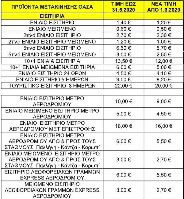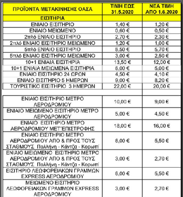 Σύμφωνα με το athenstransport.com η αναπροσαρμογή στις τιμές όλων των προϊόντων μετακίνησης του ΟΑΣΑ (εισιτήρια και κάρτες χρονικής διάρκειας) προκύπτει από την απόφαση της κυβέρνησης, στο πλαίσιο των ευρύτερων μέτρων στήριξης πολιτών και επιχειρήσεων, για μείωση του συντελεστή Φ.Π.Α. στο 13% στις μεταφορές για το διάστημα από την 1 Ιουνίου έως και 31 Οκτωβρίου 2020.