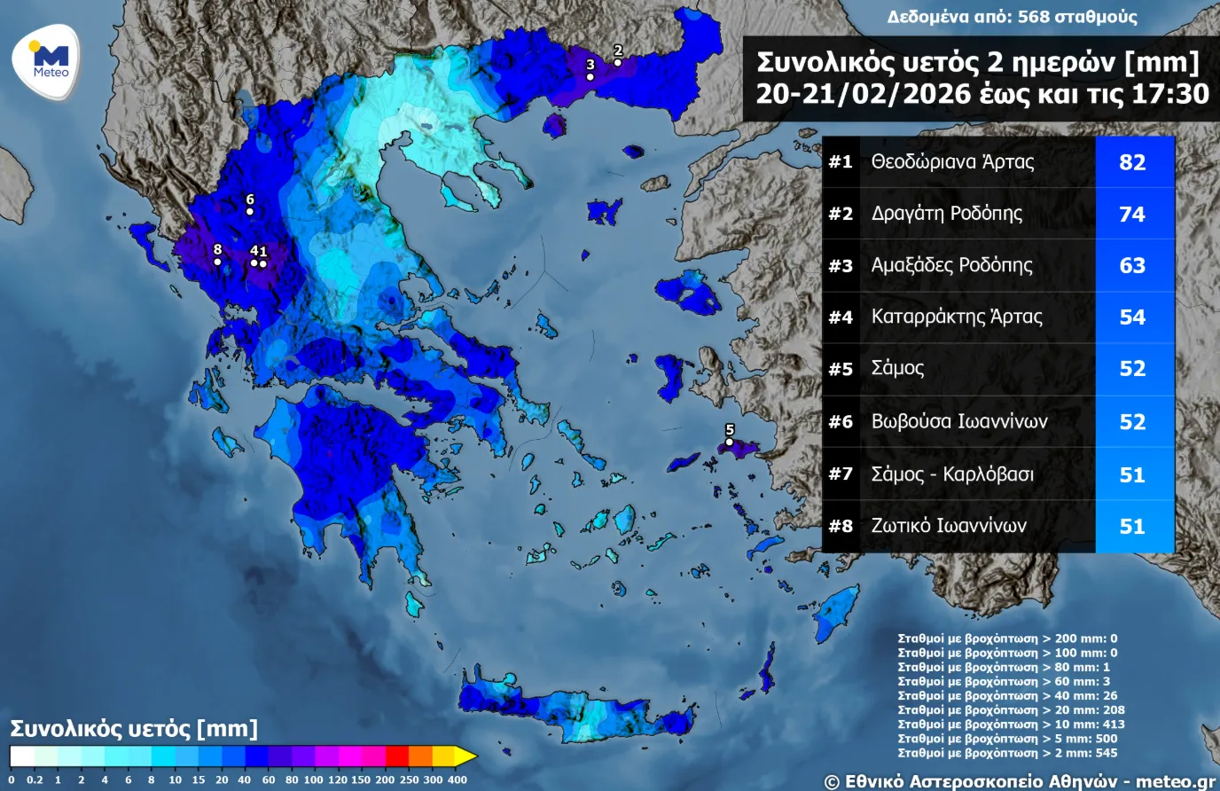 Μεγάλα ύψη βροχής καταγράφηκαν σε Ήπειρο και Θράκη, την Παρασκευή 20 και το Σάββατο 21 Φεβρουαρίου.