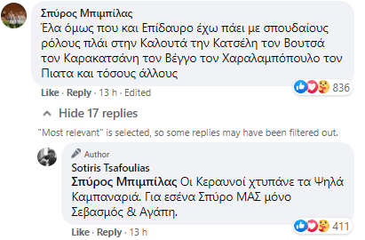 “Το πανταχόθεν βαλλομενο Σωματείο μας των ηθοποιών δυναμώνει…Έχουμε νέες εγγραφές με αμείωτο ρυθμο. Αυτο μας τιμά και μας χαροποιει εμάς τους “μέτριους”, που μας είχαν για συνεργάτες σπουδαίοι θεατράνθρωποι όπως ο Ζυλ Ντασσεν,Μάνος Χατζιδάκις, Γιώργος Μιχαηλίδης,Γιάννης Κακλεας,Γιώργος Μεσσάλας,Κοραής Δαματης,Πέτρος Ζουλιας,Ελένη Μαβιλη, Νίκος Ζερβός,Νίκος Κούνδουρος,Γιώργος Χαραλαμπίδης,ΓιωργοςΠανουσοπουλος,Τωνια Μαρκετακη,Νίκος Νικολαιδης, Λίλυ Μελεμε,Κώστας Χαραλάμπους,Άννα Χατζησοφιά,Κάρολος Ζωναράς,Κώστας Λυχναράς,Βασίλης Πλατάκης,Μάριος Ρετσιλας και τόσοι αλλοι…..Η άνοιξη θα ξαναρθει….” έγραψε στη σελίδα του στο facebook, ο Σπ. Μπιμπίλας.