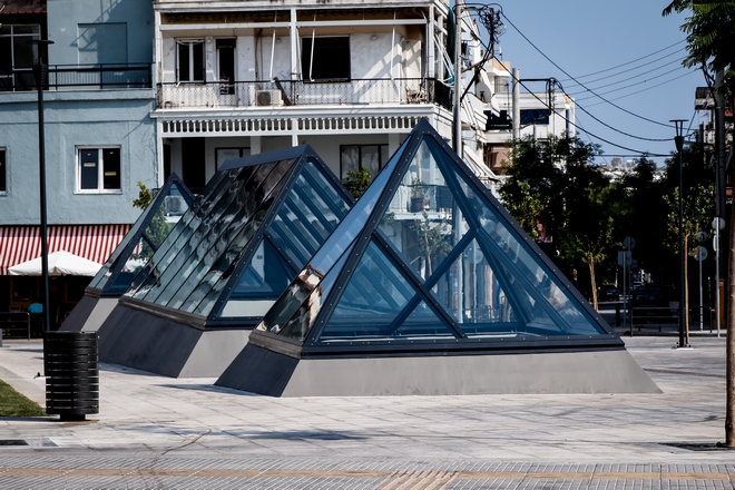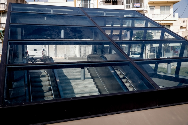 Βασικό χαρακτηριστικό του σχεδιασμού του αποτελεί η ύπαρξη δυο φεγγιτών σχήματος κόλουρου κώνου χωροθετημένων στον άξονα του Σταθμού για την είσοδο φυσικού φωτισμού στο επίπεδο έκδοσης εισιτηρίων.