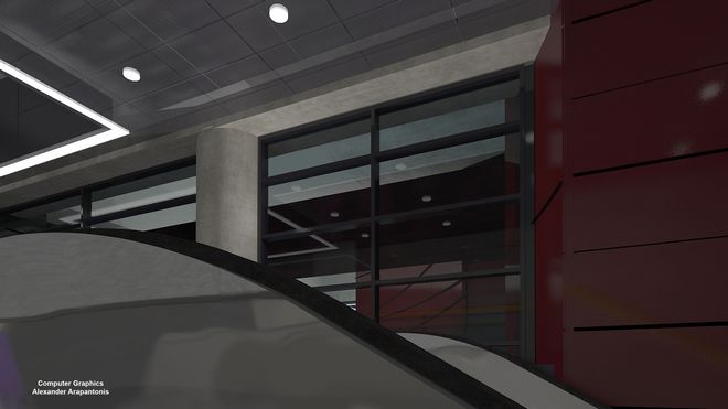 Οι κατακόρυφες επιφάνειες που περιβάλλουν το παραπάνω άνοιγμα έχουν υαλοστάσια για τον φωτισμό του χώρου έκδοσης εισιτηρίων και των χώρων διακίνησης επιβατών.