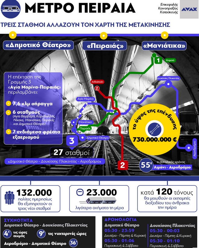 Υπενθυμίζεται πως η επέκταση της Γραμμής 3 του Μετρό «Αγία Μαρίνα – Πειραιάς» περιλαμβάνει σήραγγα μήκους 7,6 χλμ. και 6 σταθμούς (Αγία Βαρβάρα, Κορυδαλλός, Νίκαια, Μανιάτικα, Πειραιάς και Δημοτικό Θέατρο), καθώς και επτά ενδιάμεσα φρέατα εξαερισμού. Συνολικά η Γραμμή 3 «Δημοτικό Θέατρο – Δουκίσσης Πλακεντίας – Αεροδρόμιο» αριθμεί πλέον 27 σταθμούς.