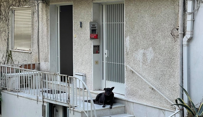 Ο σκύλος του Μίκη Θεοδωράκη ξαπλωμένος στο πλατύσκαλο του σπιτιού του news24/7