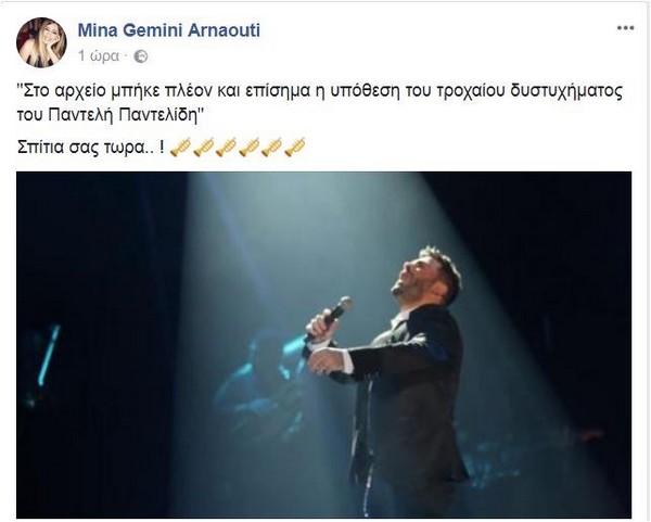 “Στο αρχείο μπήκε πλέον και επίσημα η υπόθεση του τροχαίου δυστυχήματος του Παντελή Παντελίδη… Σπίτια σας τώρα..!”, έγραψε χαρακτηριστικά. Και στη συνέχεια σχολίασε απαντώντας σε χρήστη του διαδικτύου: “όλα καλά! Δικαίωση”, αλλά και “Ο Παντελάκος θα χαίρεται ! Τον είδα κ στον ύπνο μου χθες”.