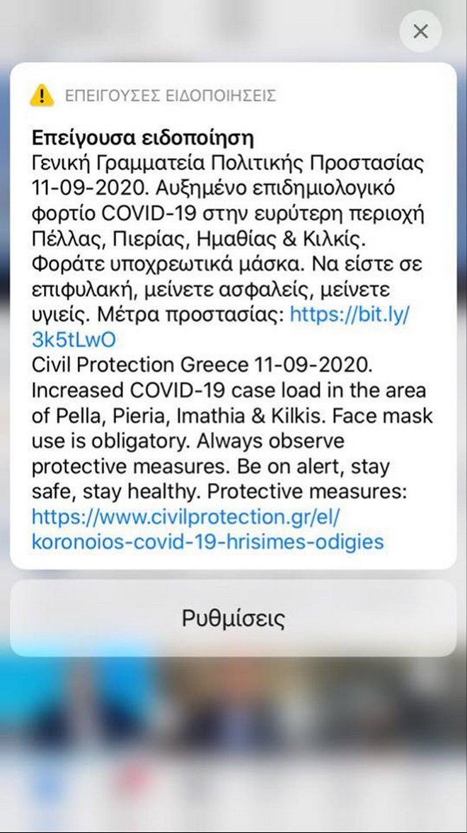 “Γενική Γραμματείας Πολιτικής Προστασίας 11-09-2020. Αυξημένο επιδημιολογικό φορτίο COVID-19 στην ευρύτερη περιοχή Πέλλας, Πιερίας, Ημαθίας & Κιλκίς. Φοράτε υποχρεωτικά μάσκα. Να είστε σε επιφυλακή, μείνετε ασφαλείς, Μείνετε υγιείς”, ήταν το μήνυμα που εμφανίστηκε στα κινητά των πολιτών. Το μήνυμα αναγραφόταν και στην αγγλική γλώσσα.