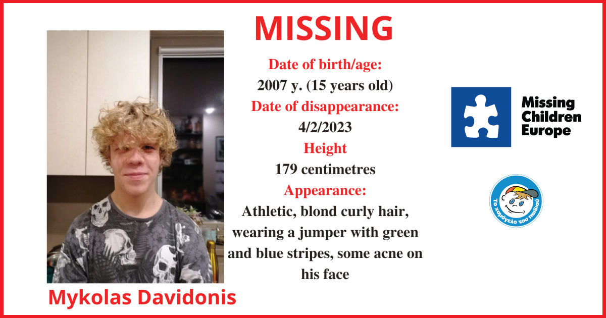 Η αναδημοσίευση της φωτογραφίας του ανήλικου Mykolas (ον.) Davidonis (επ), 15 ετών, αποσκοπεί στην συνδρομή όλων μας για τον άμεσο εντοπισμό του.