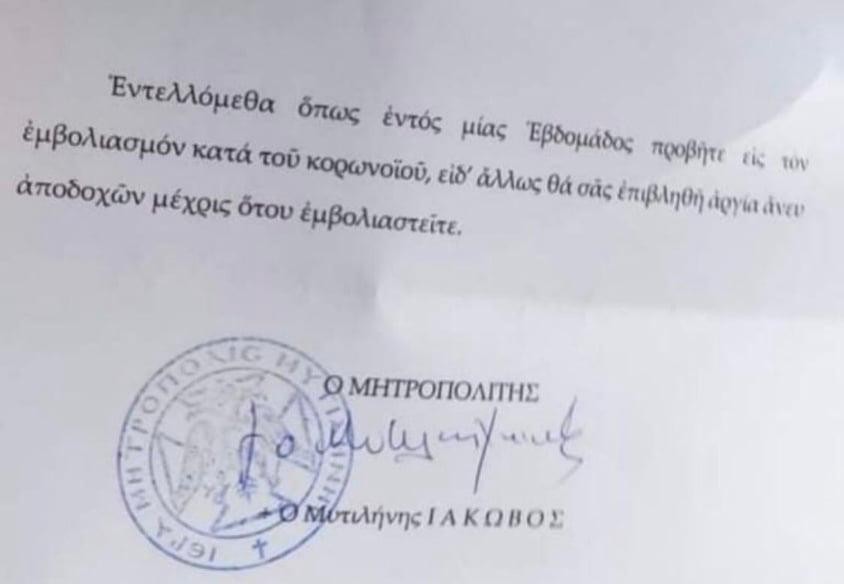 Σύμφωνα με το έγγραφο, δίνει διορία μιας εβδομάδας στους ιερείς να κάνουν έστω την πρώτη δόση του εμβολίου αλλιώς θα τεθούν σε αργία η οποία θα συνοδεύεται και με στέρηση του μισθού τους δίνει μέσω επιστολής που απέστειλε στους κληρικούς του ο Μητροπολίτης Μυτιλήνης, Ερεσσού και Πλωμαρίου κ. Ιάκωβος.